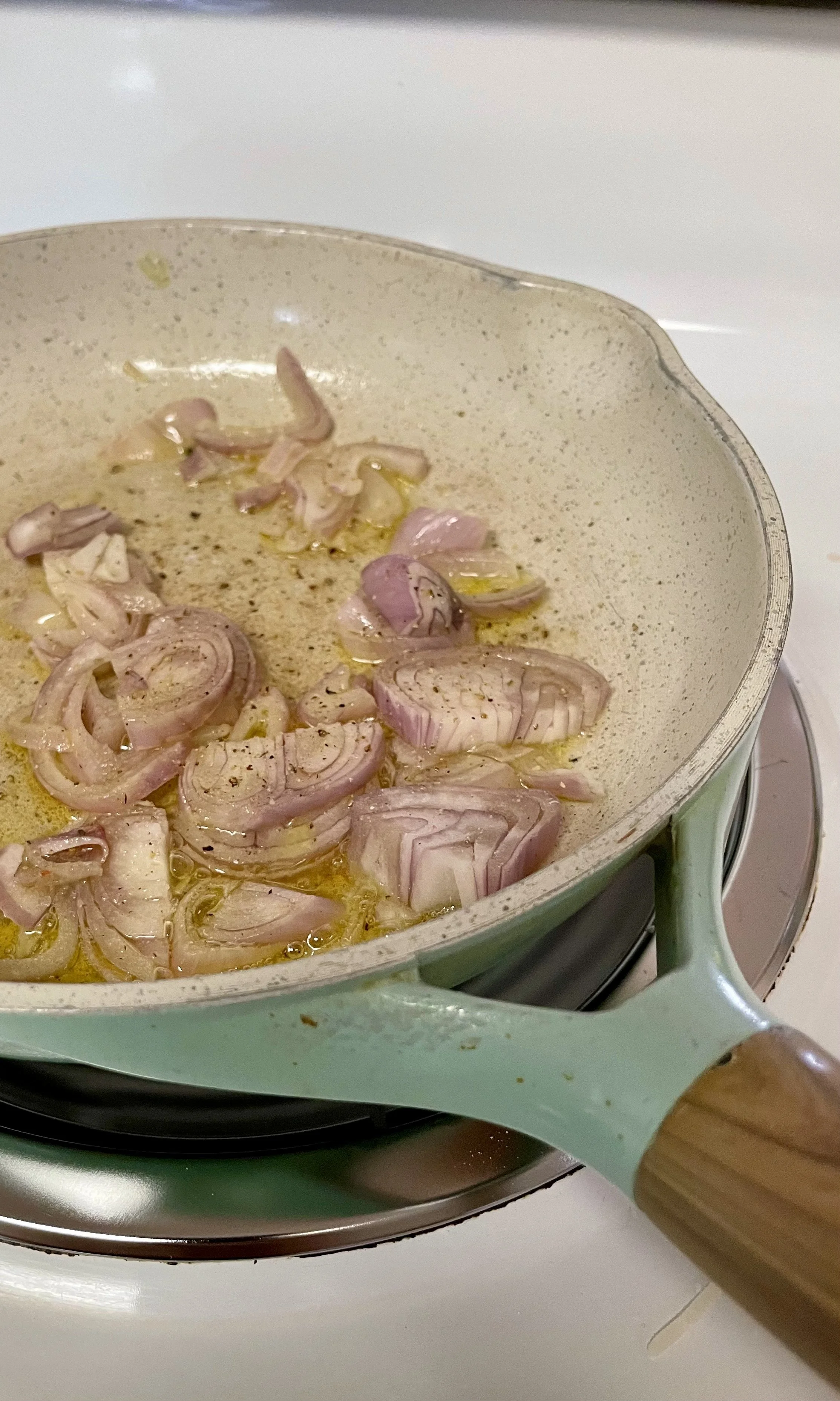 - Roughly chop the shallots and pan fry on medium heat with 2 tbsp of olive oil. Cook for 3-5 min. They are done when they look a bit translucent and are you can smell their deliciousness.