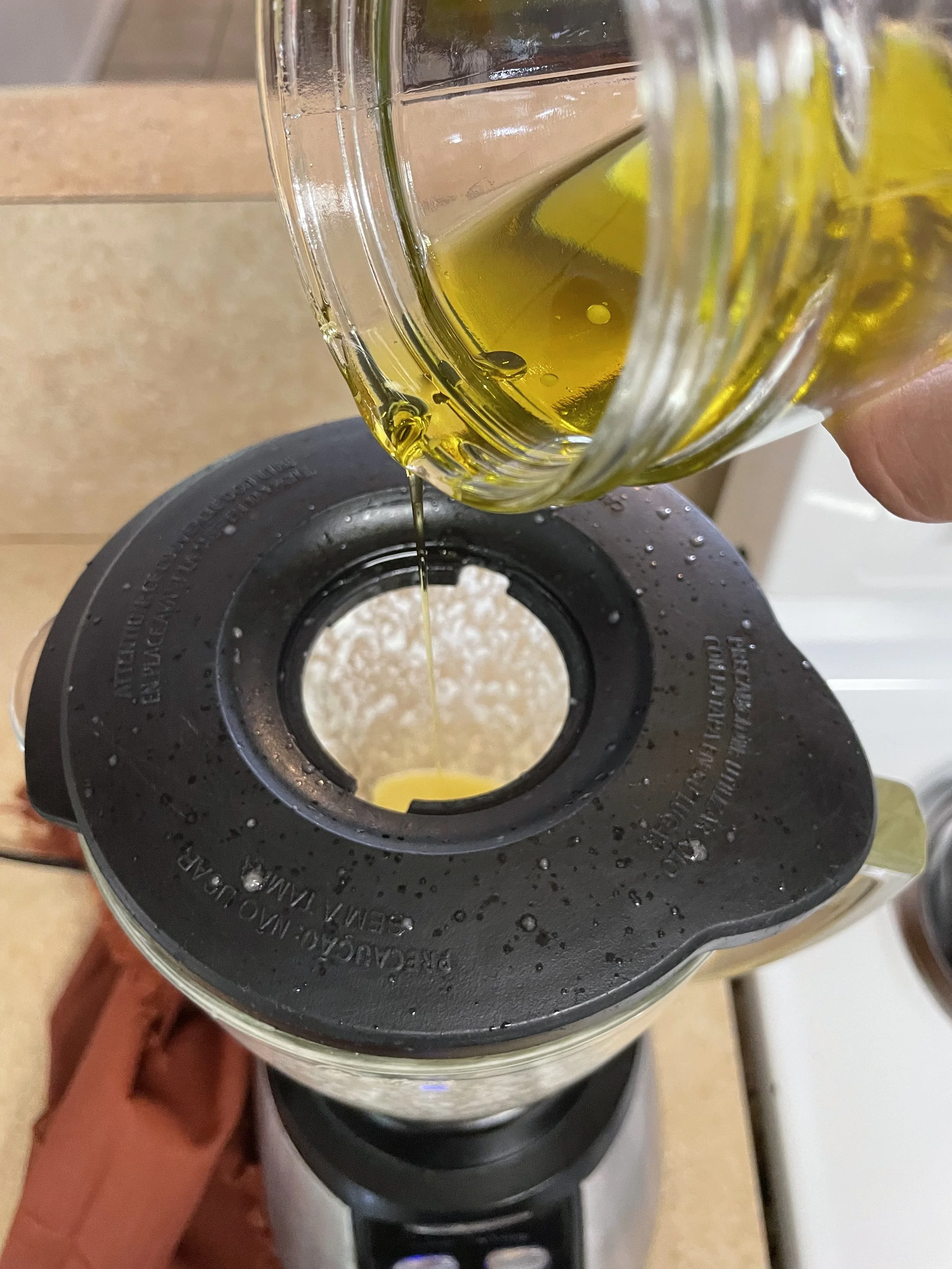 - Remove the lid to the blender, set the speed on low, and slowly drizzle the olive oil into the dressing. The slower the better. This step is meant to emulsify the dressing, meaning that if you go slow enough, then the dressing will not separate.