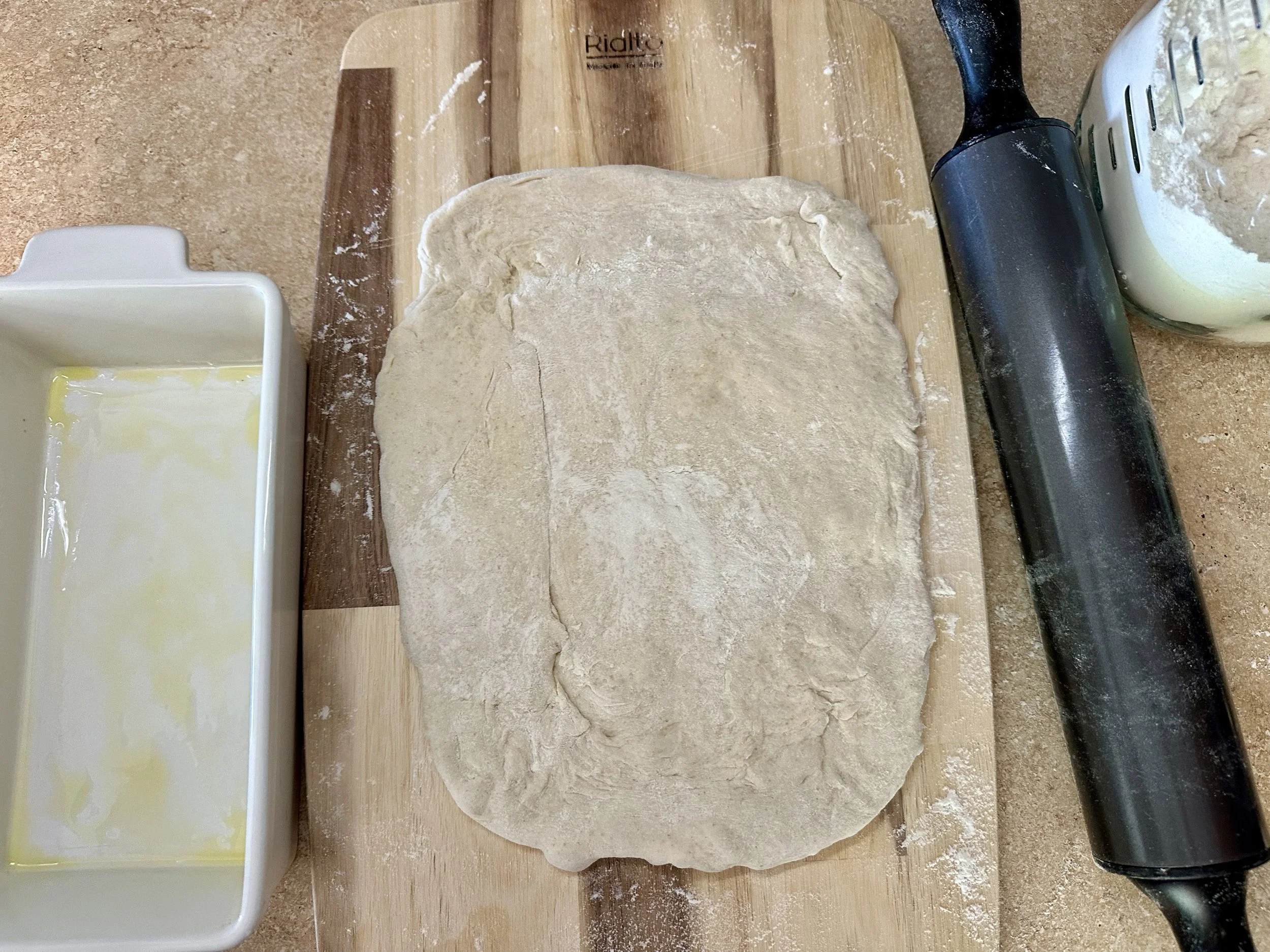 - Turn the dough onto the counter and gently press it into a rectangle. Roll it up tightly into a log and place seam-side down into a loaf pan lightly coated with olive oil.